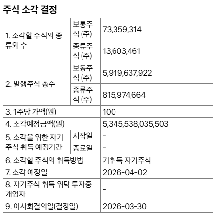 – 4월 2일 장 시작과 함께 소각할 주식 : 73,359,314주 (약 1.24% 감소)